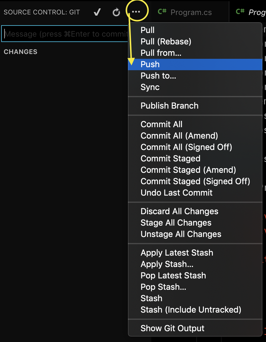 3. Since VS Code is Git-aware, let’s push these changes up to our Github repository.