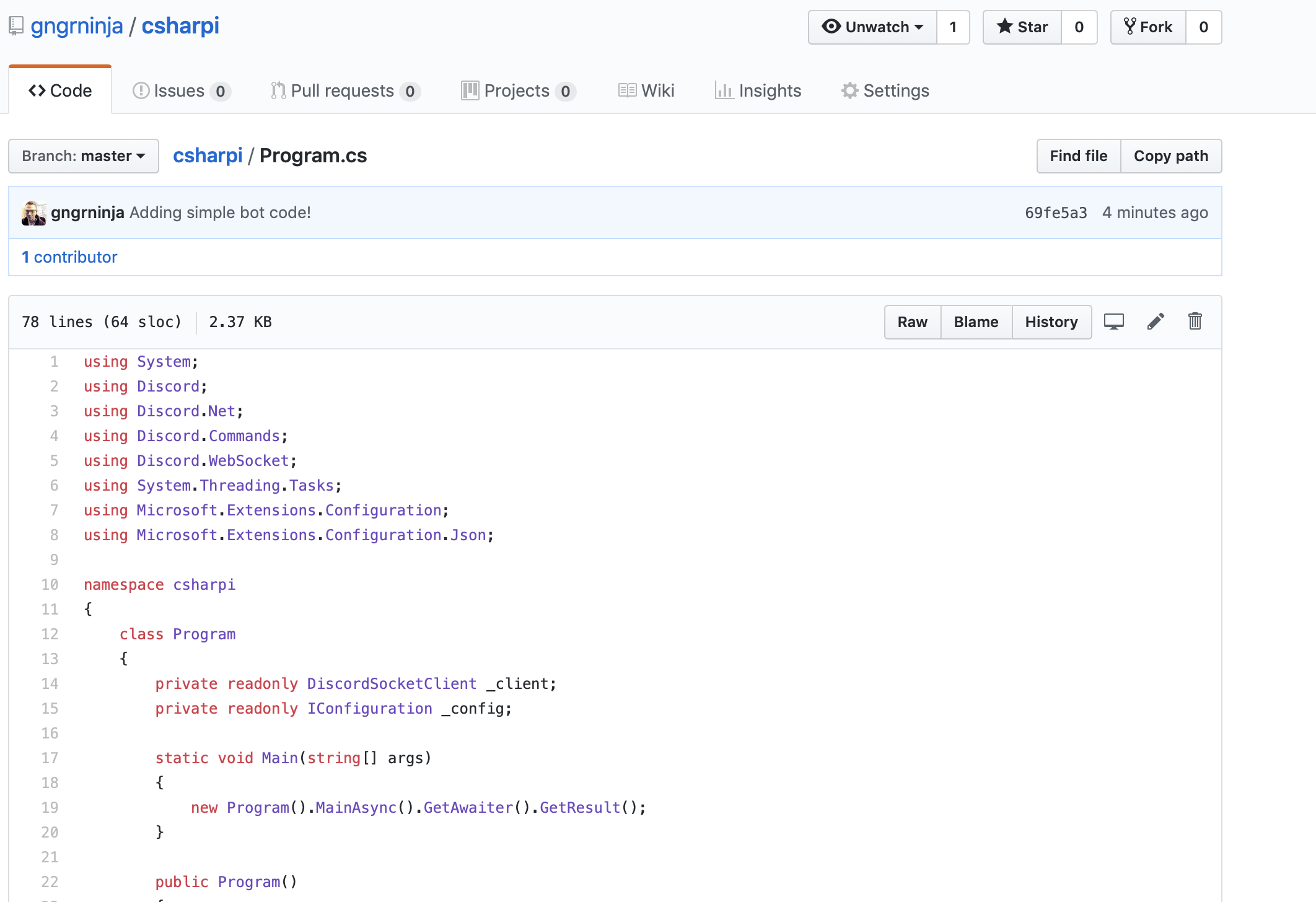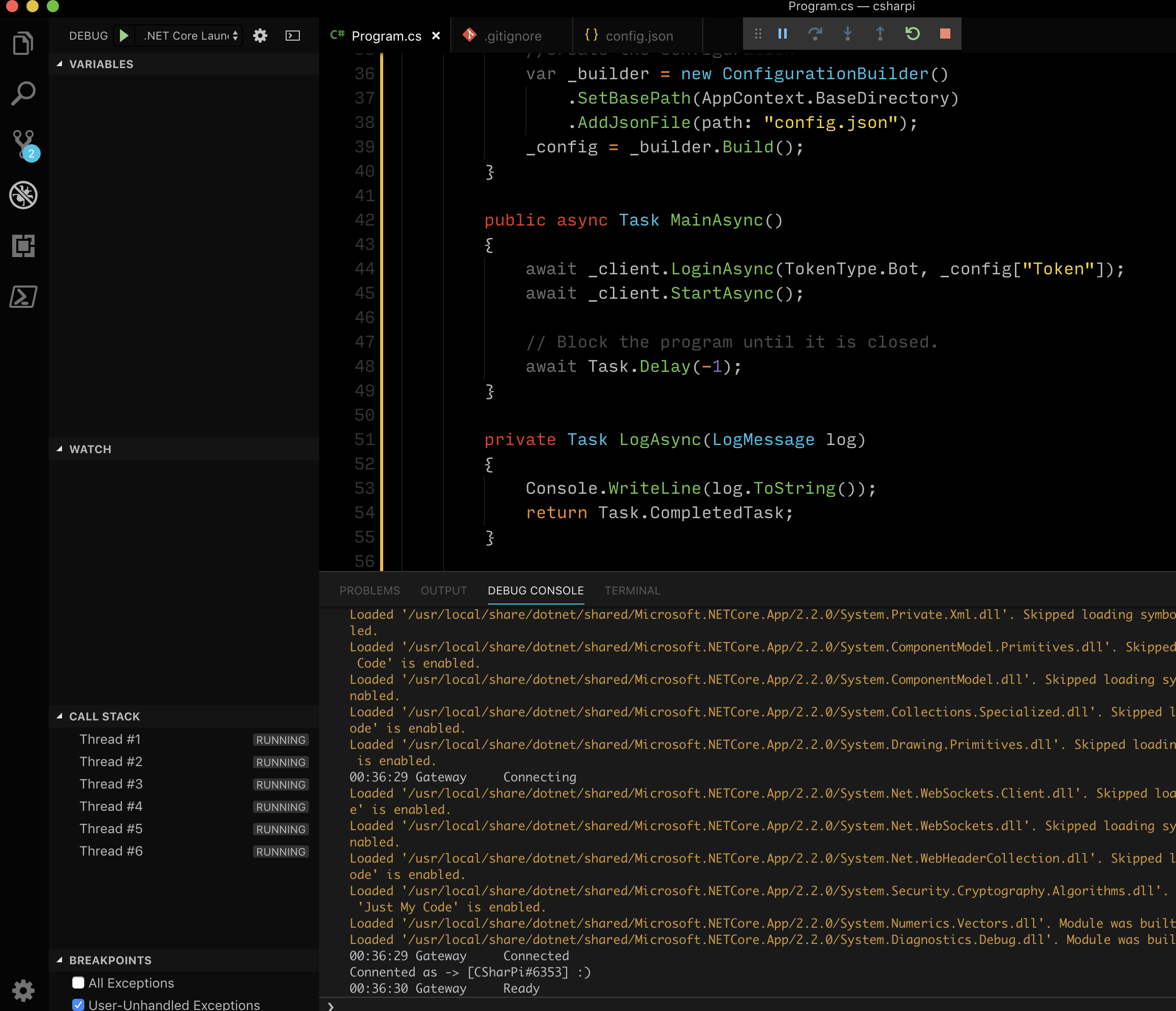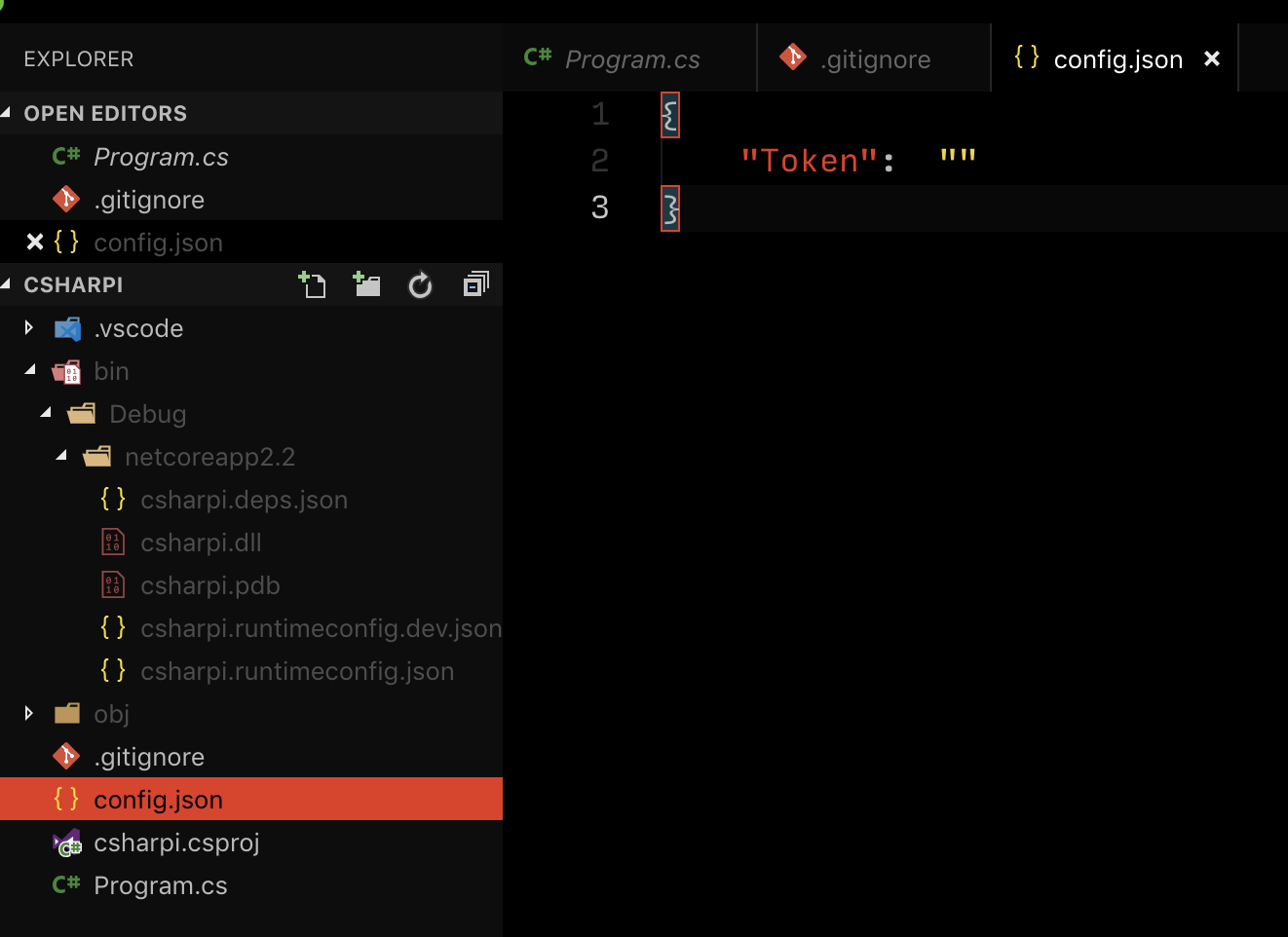 Now we’re going to replace the contents of Program.cs with the simple bot code. This code will be the basis for future posts to come.