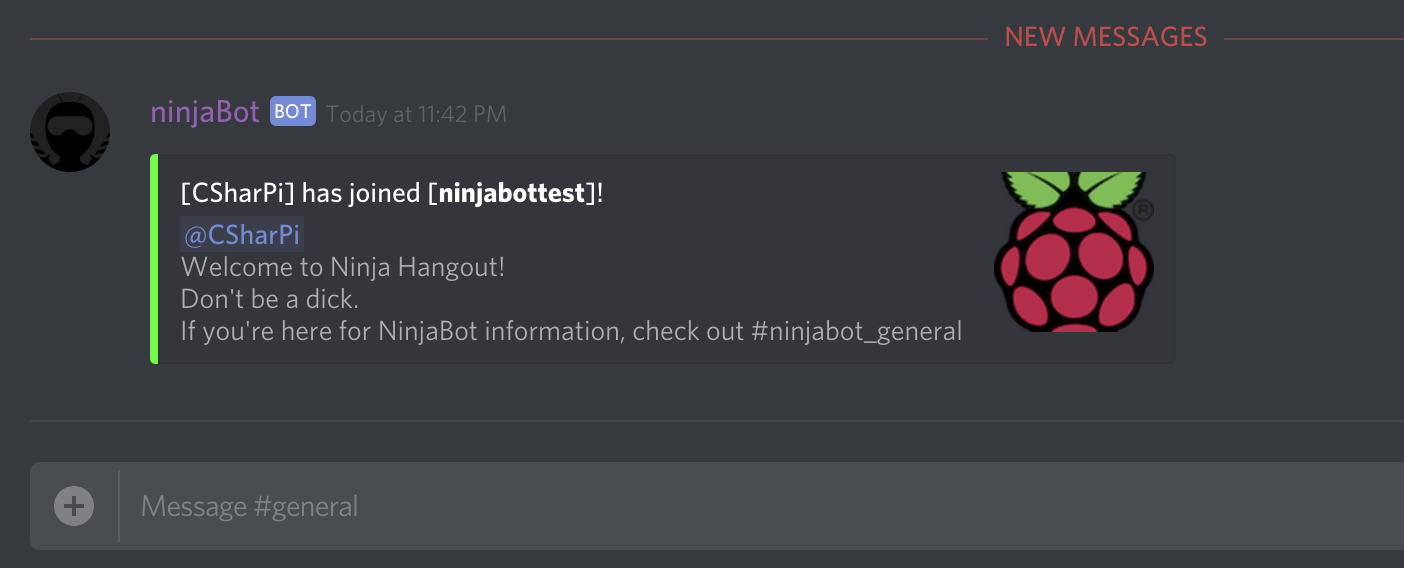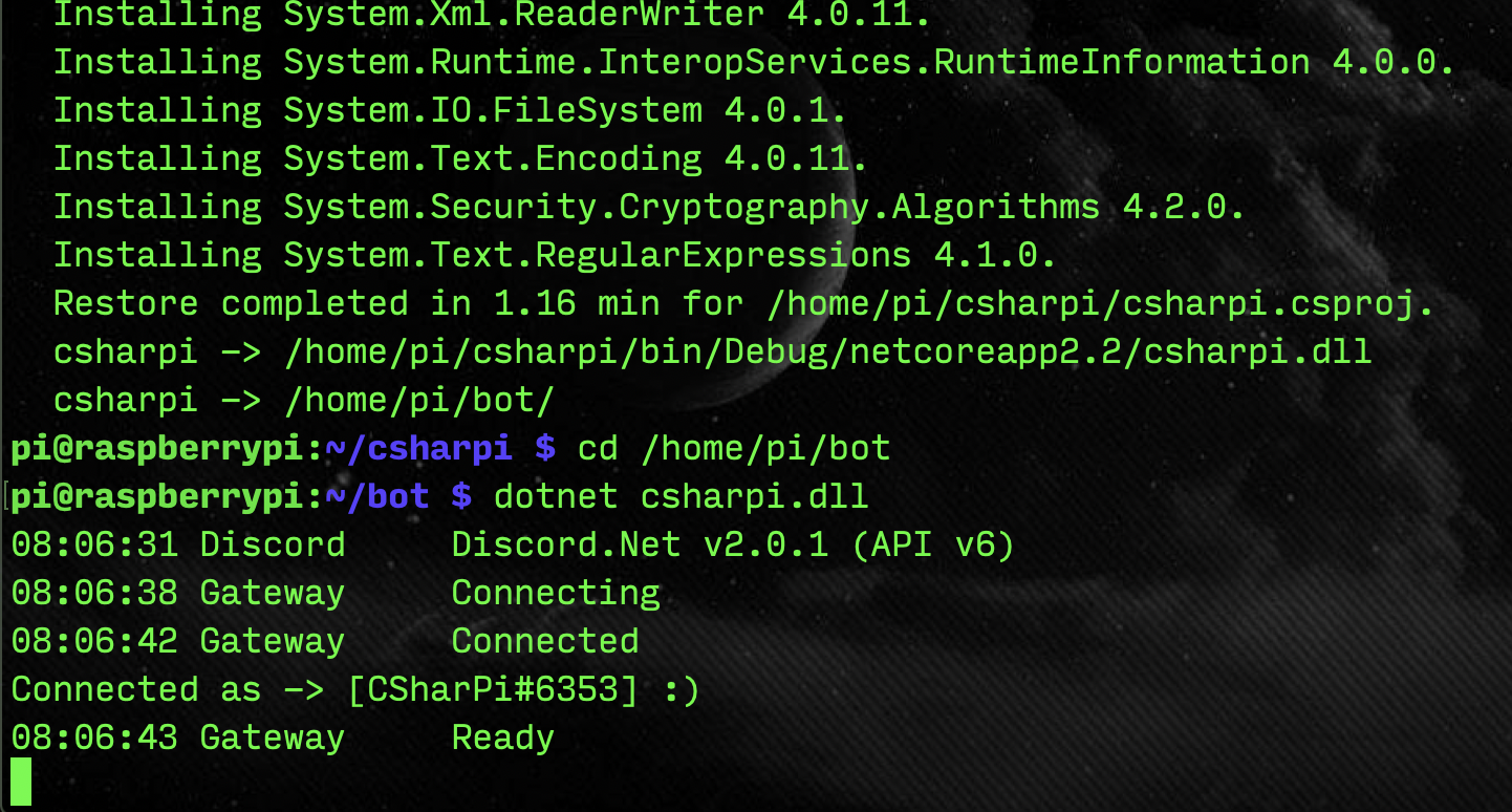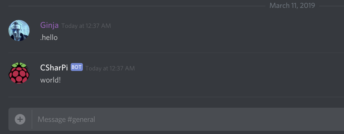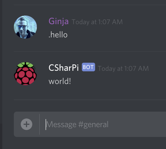 And there you have it, a Discord bot running on a Raspberry Pi, with .NET and C#. The next parts of this series will go over proper command handling (hint: not how we did it here), and more!