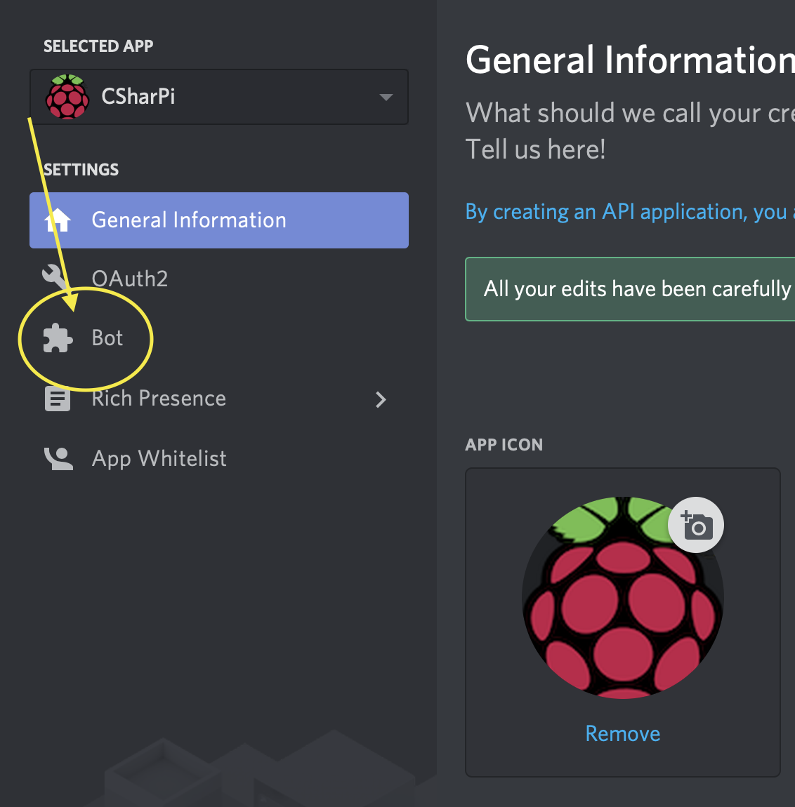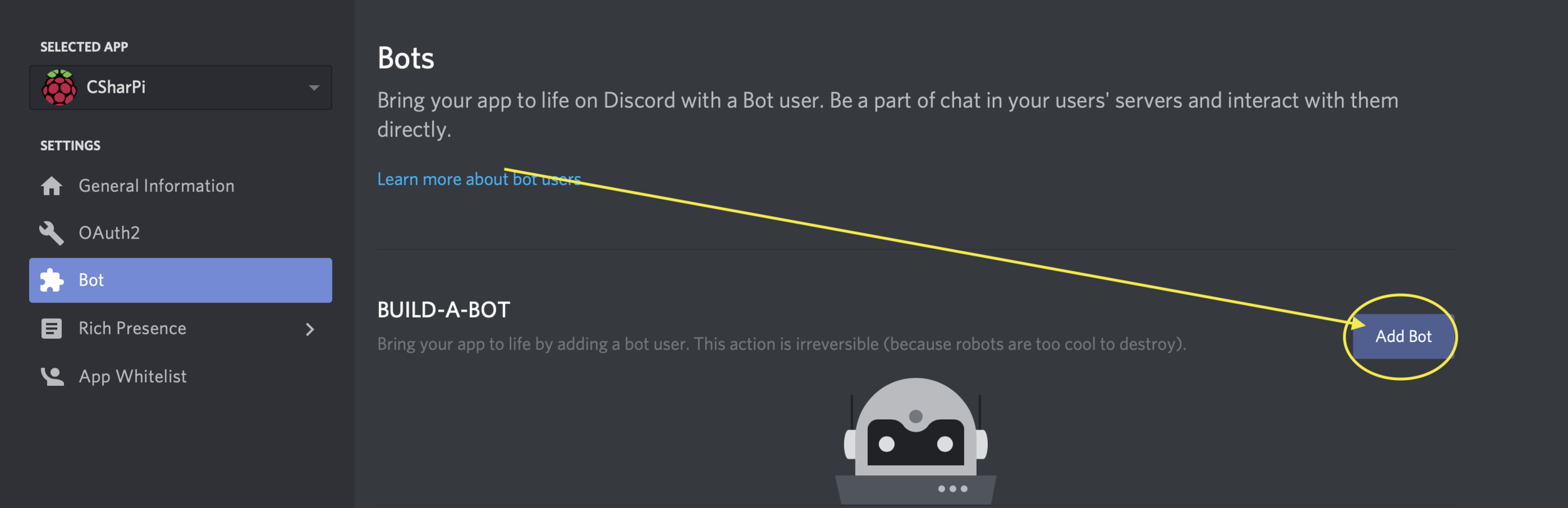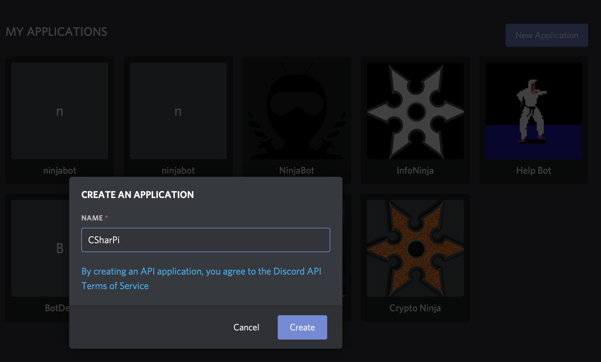 5. Navigate back to https://discordapp.com/developers/applications/, and click the application we made earlier.