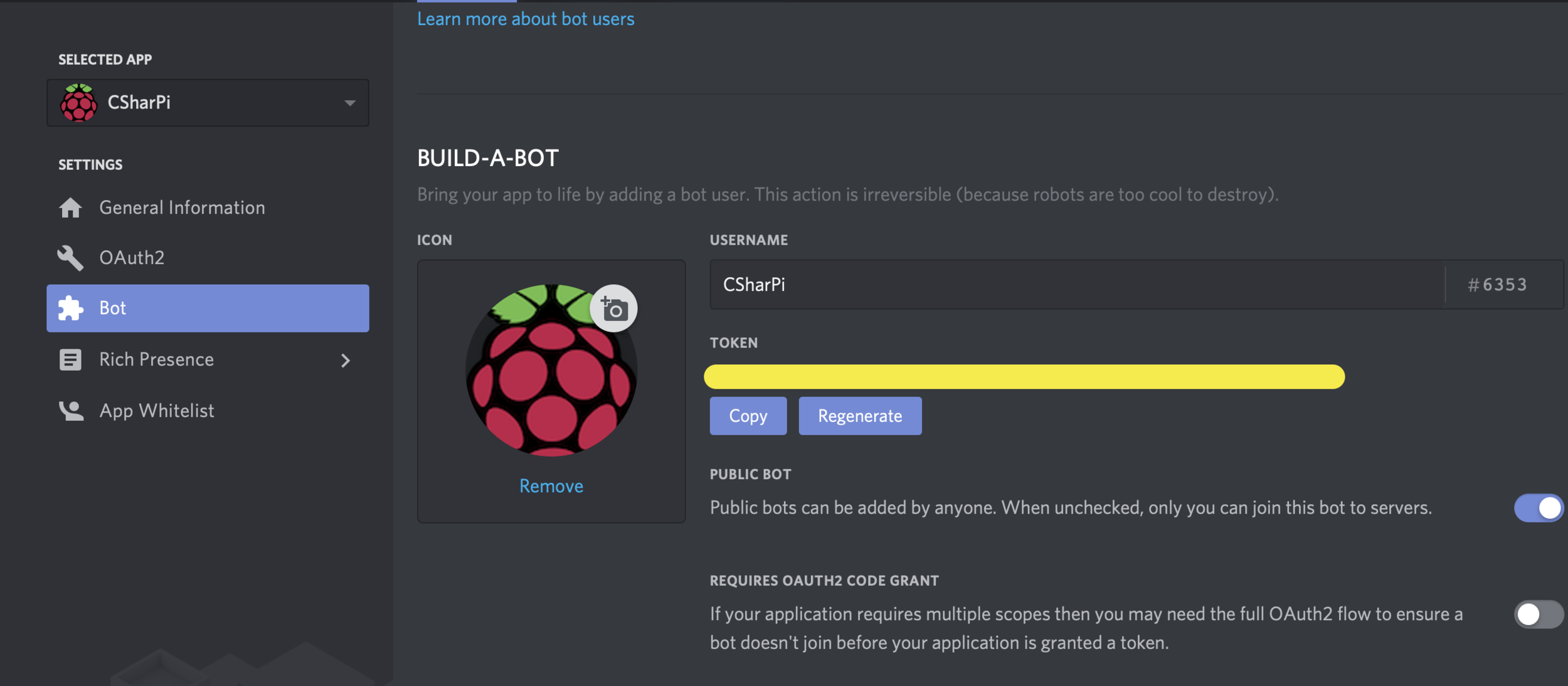 5. Now you should see an option to reveal the bot’s token. We will need to get this information shortly.