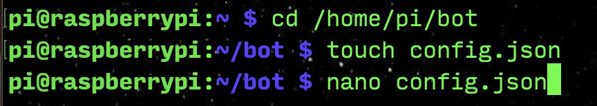 5. Open the config.json file in /home/pi/bot on the Pi in nano: