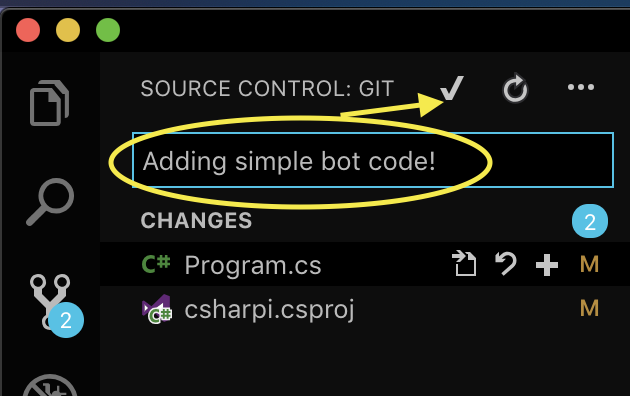 4. Add a commit message and click the checkmark icon to stage/commit the files.