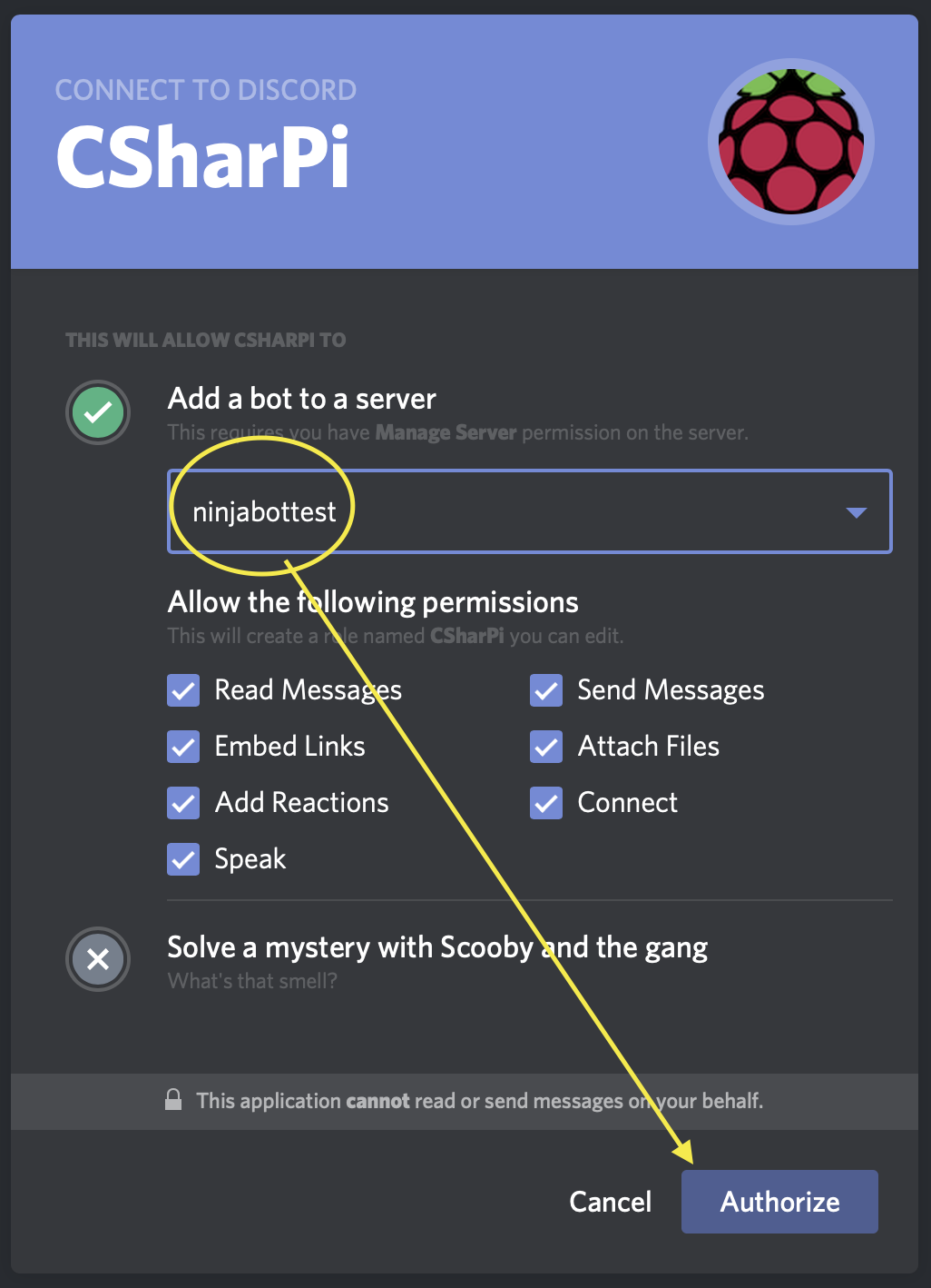 9. Confirm the server you are adding the bot to, and click “Authorize”.