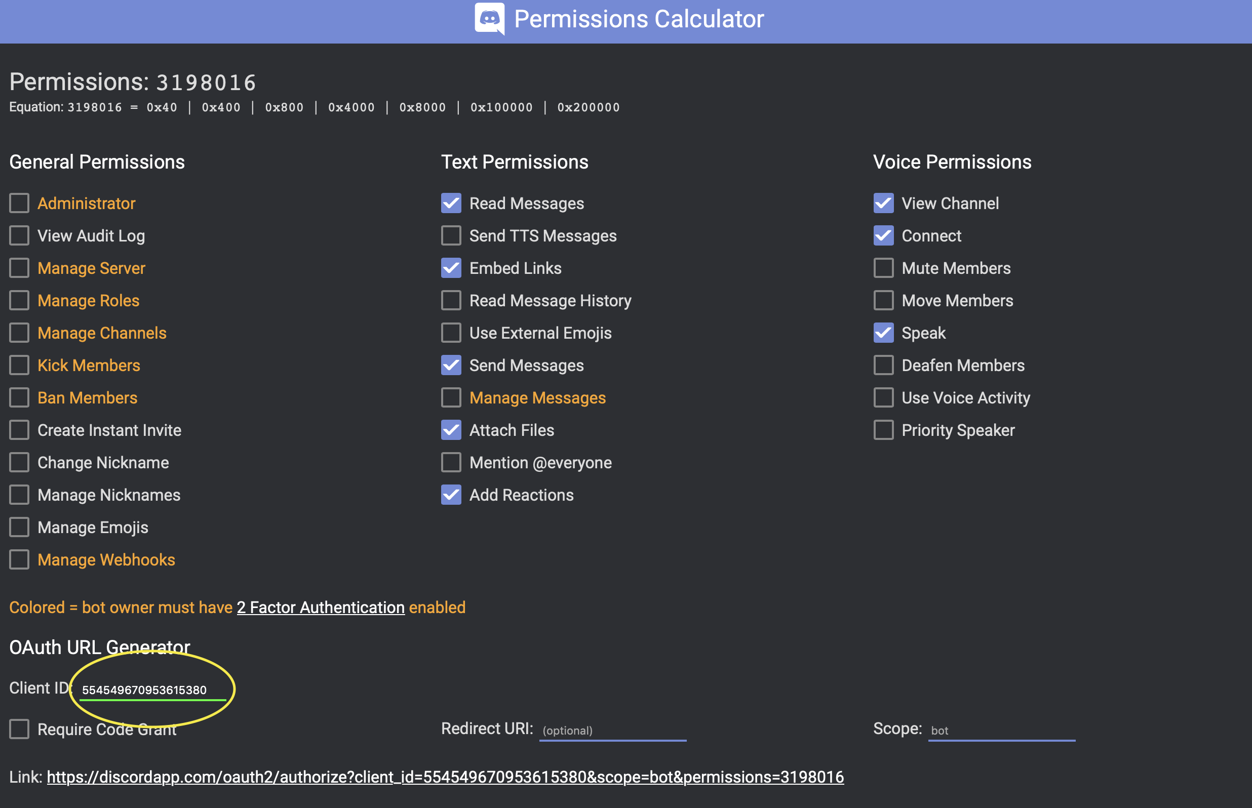7. Go to https://discordapi.com/permissions.html#3198016, and input your client ID towards the bottom. I’ve added the basic permissions that will be good for this example bot. Feel free to add more if you’d like.
