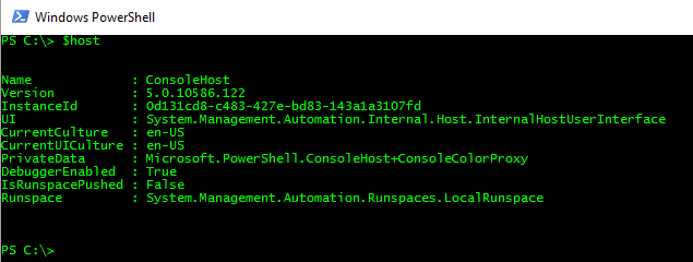 PowerShell stores the version in a special variable dedicated to host information. This variable is aptly named $host. To see the value of this variable, type $host into your console and press enter. You should see a similar result to this: