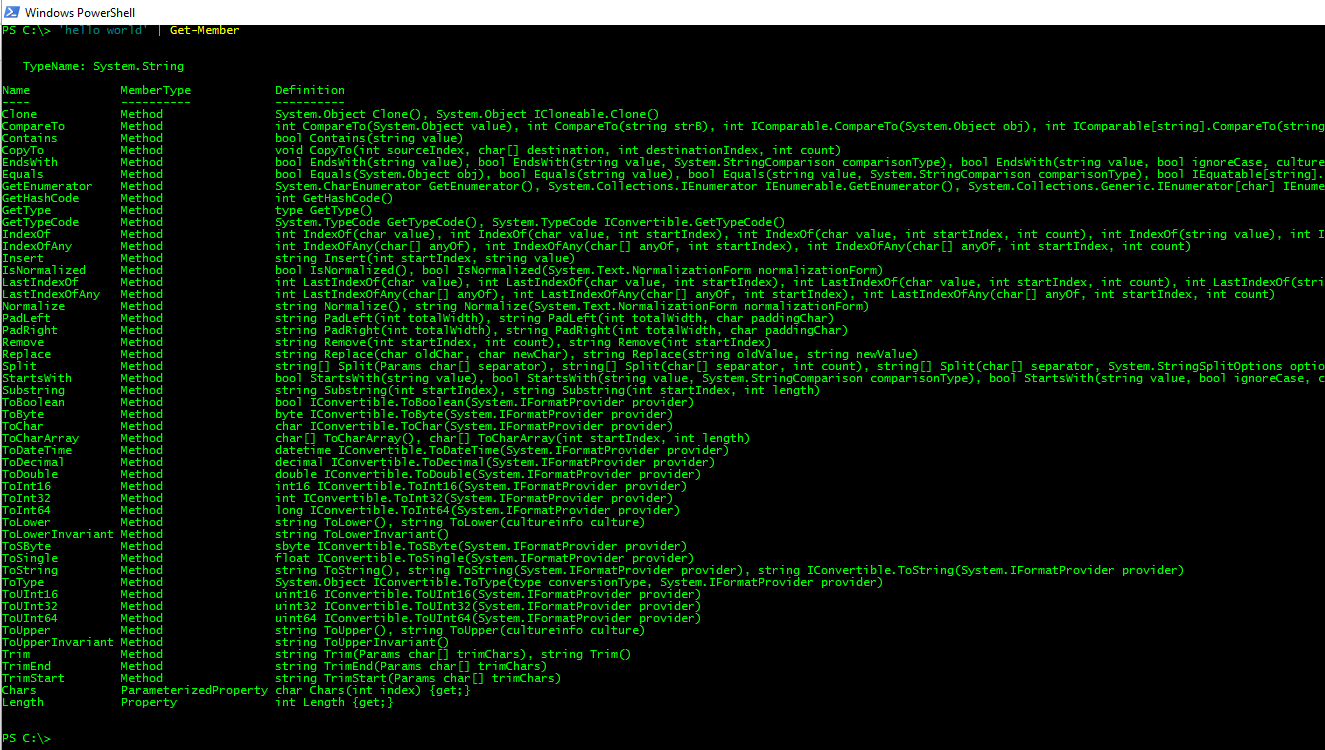 Since 'Hello World' is an object, we can pipe it via "|" to Get-Member to see what we can do with it. Piping in PowerShell is the act of adding the "|" character to take the results of the input before it, and pass that over to the next command. Let's go ahead and run this: