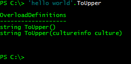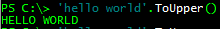 You can see that the object Type is of System.String, and below that the various methods and properties. To use them, simply add a dot after 'Hello World' and specify the one you'd like to use. For instance, I wonder what ToUpper does. Let's see!