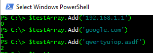 Arrays in PowerShell always start with 0, and when we use the .Add method on this array you can see it outputs the index of the element(value) we are adding. To add an element without seeing that, simply pipe $testArray.Add('yahoo.com') to Out-Null.