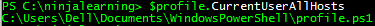 Let's take a look at the file PowerShell uses for your current user profile on all hosts (meaning the ISE and console). We'll get into the different host types in a different post. The special variable we'll want to look at is $profile, and we'll want to see the CurrentUserAllHosts property.