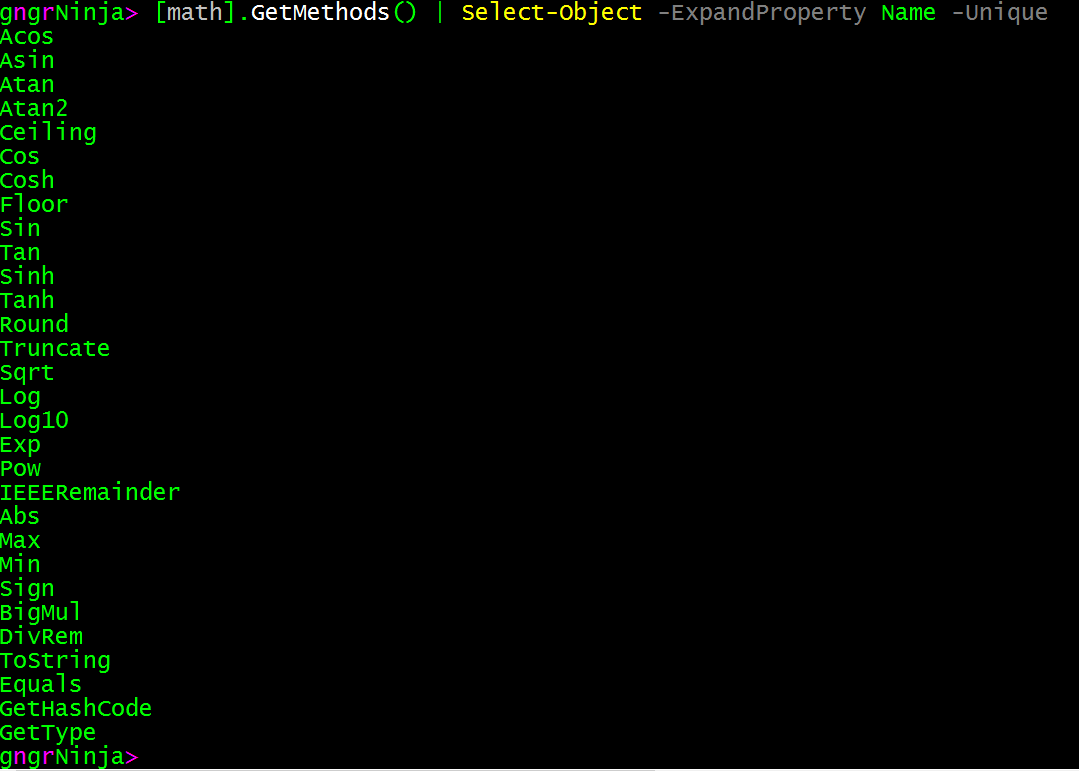 [math].GetMethods() | Select-Object -ExpandProperty Name -Unique