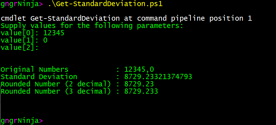 With all this going on, I figured why not write some PowerShell! My girlfriend has been asking me to write a script/function to help her out with calculating standard deviation in a quick fashion (preferably 10 key input). So here we are.