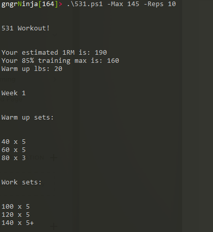 Running it like this will give you an output in the console of what your 5/3/1 routine at this max and rep range would be.