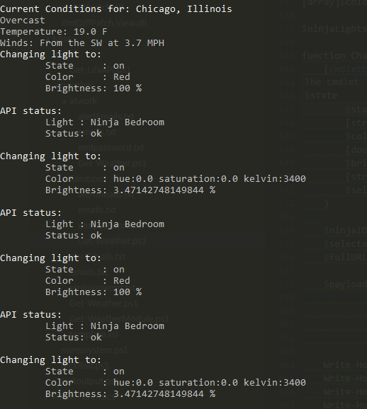 $weather = .\Get-Weather.ps1 -city Chicago -lifx $true