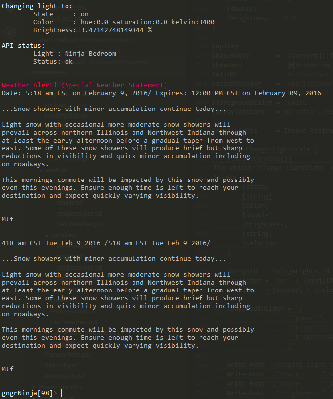 I wrote the above function as a script initially when I learned that LIFX provides and API you can use to control your light! It is currently called if the parameter lifx is $true, and if there is a current alert.