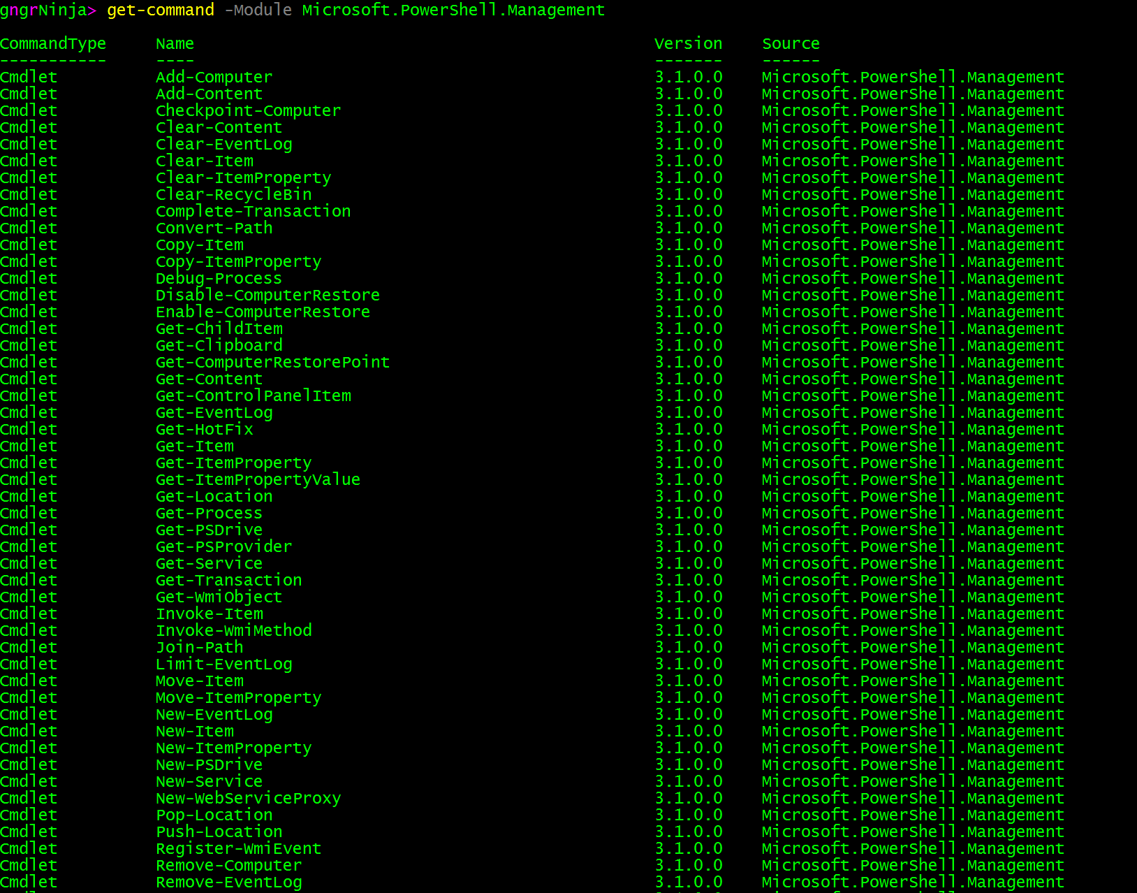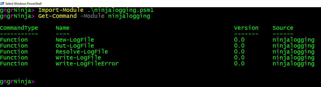 Above I imported my module to add logging functionality via specific functions I created. I then ran Get-Command -Module ninjalogging to get a list of commands it provides.
