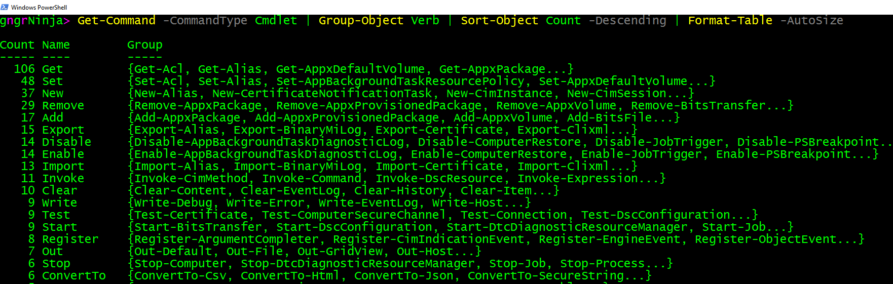 Get-Command -CommandType Cmdlet | Group-Object Verb | Sort-Object Count -Descending | Format-Table -Autosize