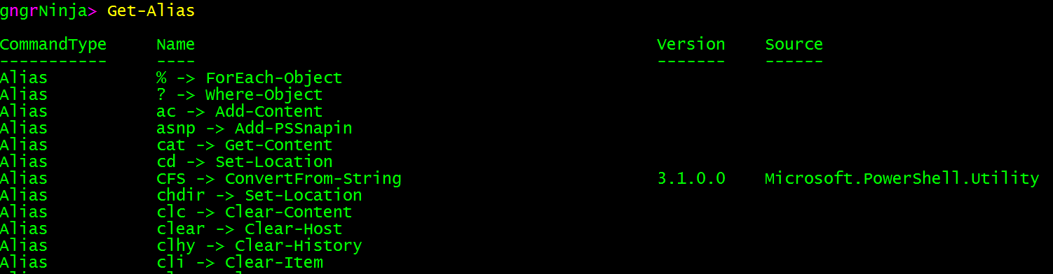 There are aliases in PowerShell that make writing out one-liners and troubleshooting during a fire easier to manage. To see a list of aliases type Get-Alias.