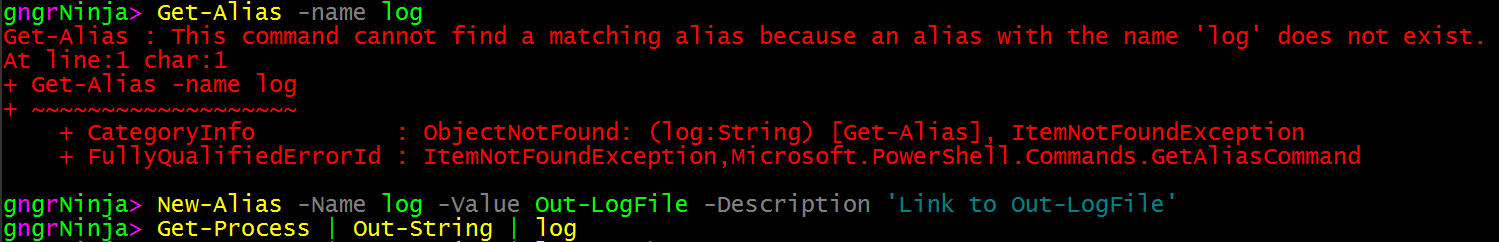 Get-Alias -name log New-Alias -Name log -Value Out-LogFile -Description 'Link to Out-LogFile' Get-Process | Out-String | log