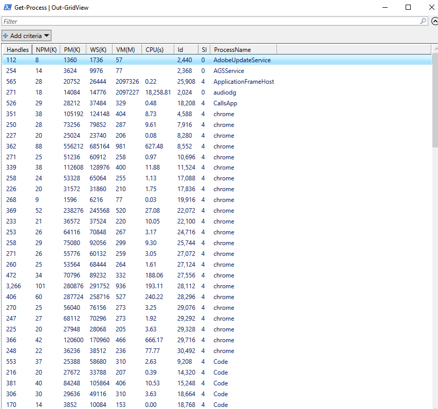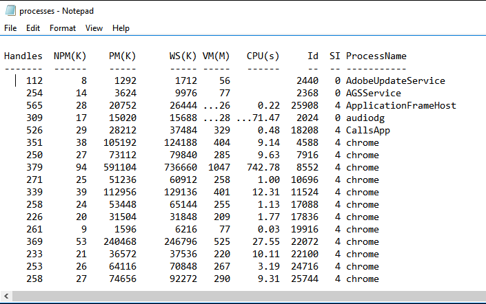 We can also use Get-Process with > and >>. These are very simple ways to output the results to a file.