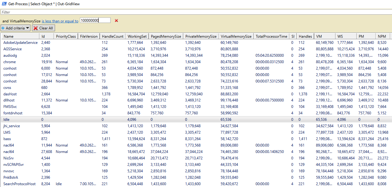 I added one here (Use the [+ Add Criteria] button in the upper left) for VirtualMemorySize that islessthanorequalto 100000000.