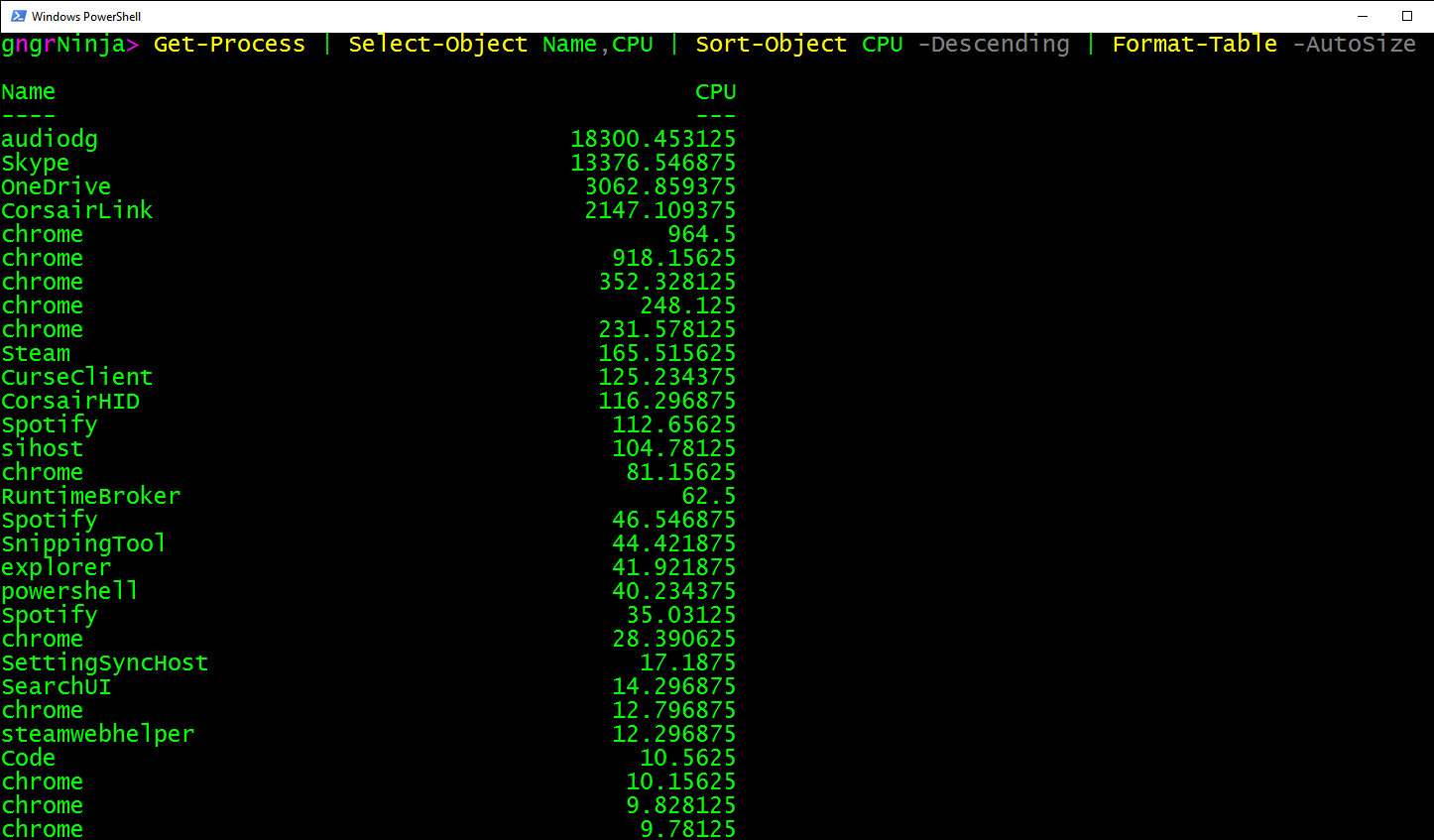 Get-Process | Select-Object Name,CPU | Sort-Object CPU -Descending | Format-Table -AutoSize