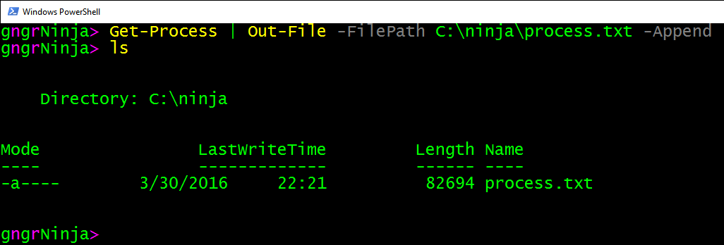 Get-Process | Out-File -FilePath C:\ninja\process.txt -Append