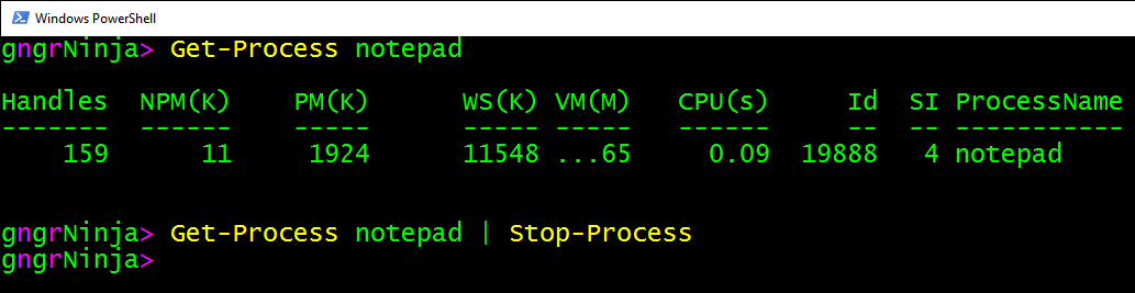 This can, however, be a handy way to kill a hung process. Let's say you wanted to close any open notepad.exe instances.