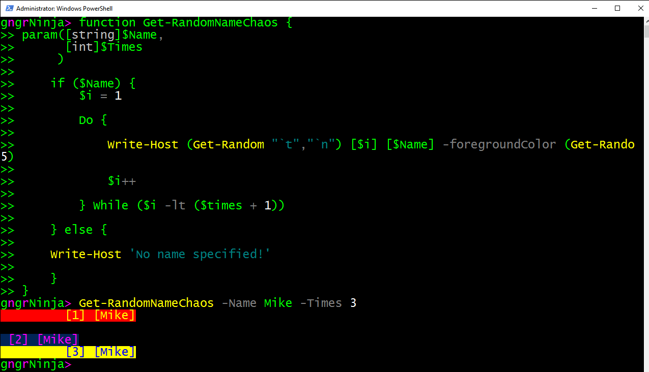 This function we created has [int] next to the $Times parameter. This means that if you put anything other than an integer as a value, you will get an error message.