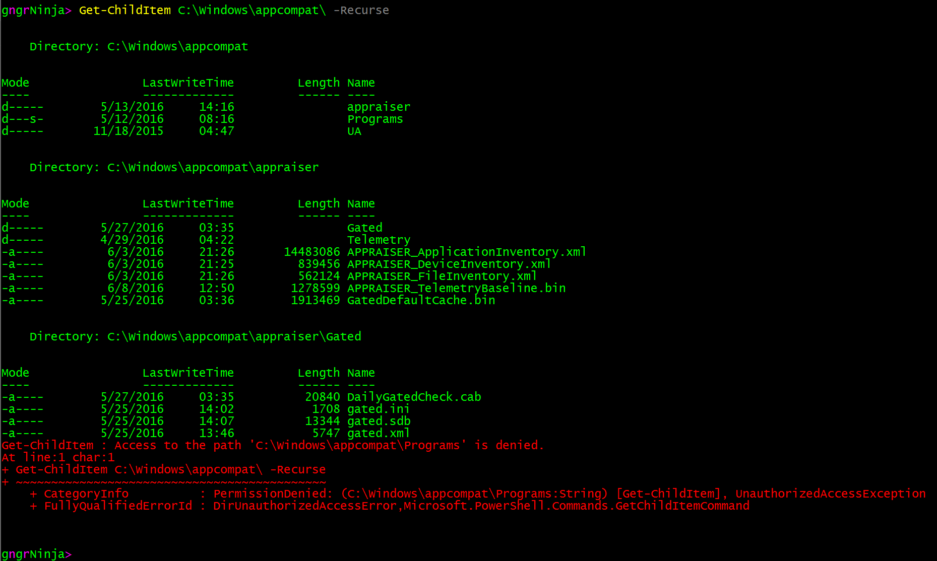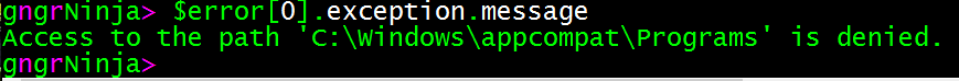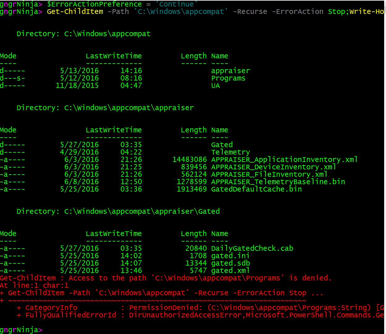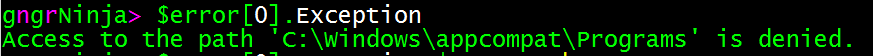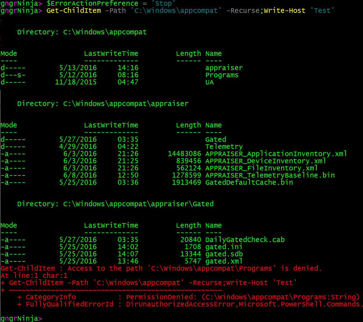 Get-ChildItem -Path 'C:\Windows\appcompat' -Recurse -ErrorAction Stop;Write-Host 'Test'