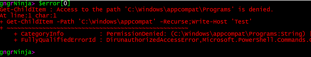Now the exception from Get-ChildItem command is caught since the catch-all Catch block code is executed.