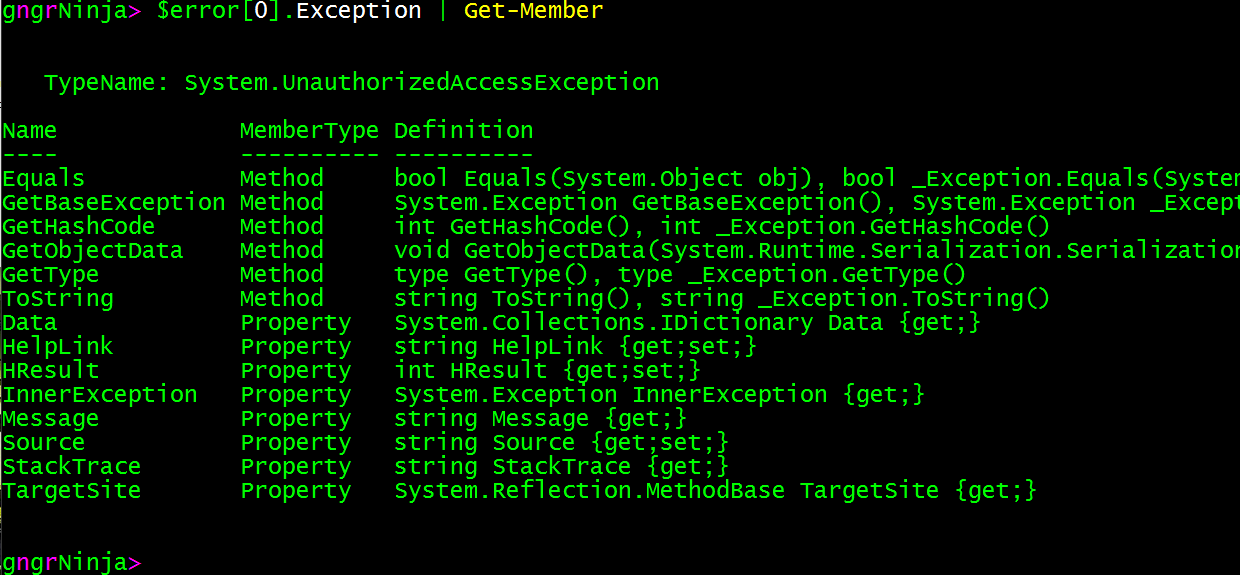 Here you can see the TypeName: [System.UnauthorizedAccessException], and the various methods and properties of the exception. The exception TypeName is used later when we catch specific errors.