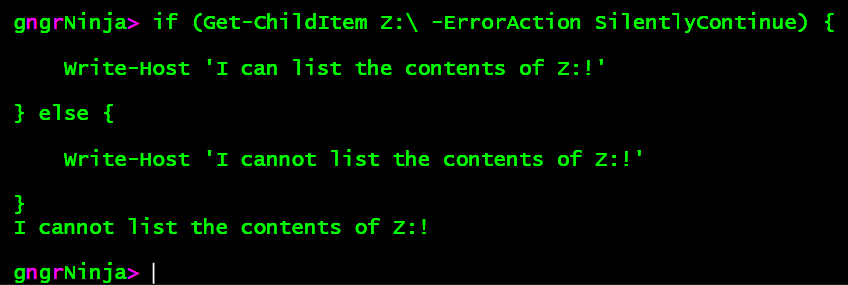 This does not return true, as expected, and thus we see the message from the code in the else portion of the if statement. We use the -ErrorAction common parameter with the value SilentlyContinue to suppress the error from being displayed to the end user of the script. No need in this case, as we're simply using the command for validation.