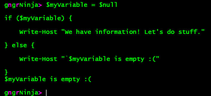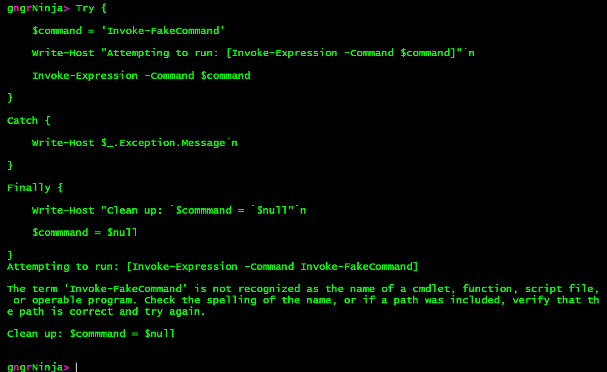 We then see the output from the Write-Host command in our Finally block. We use the finally block to free up the $command variable.