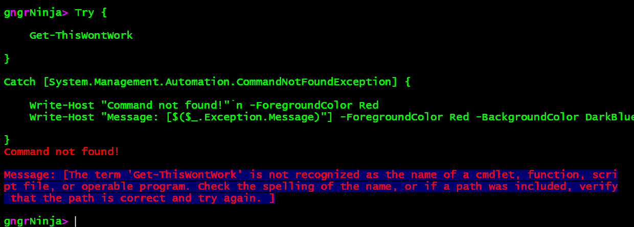 Write-Host 'Command not found Catch block executed!'