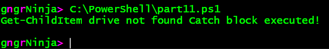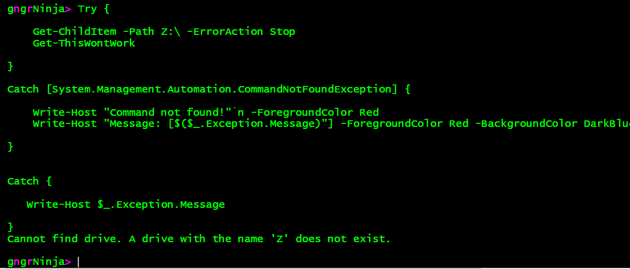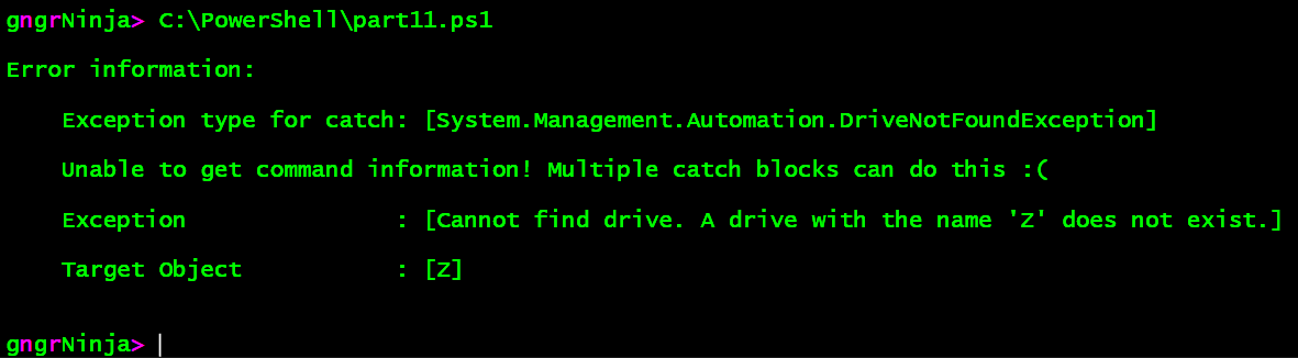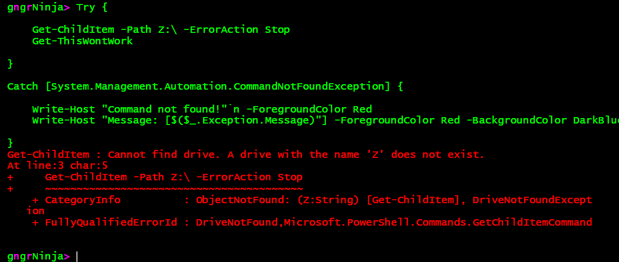 So now, if we wanted to catch this exception on it's own, we would need to add a catch block for [System.Management.Automation.DriveNotFoundException].