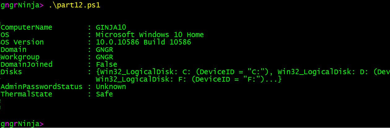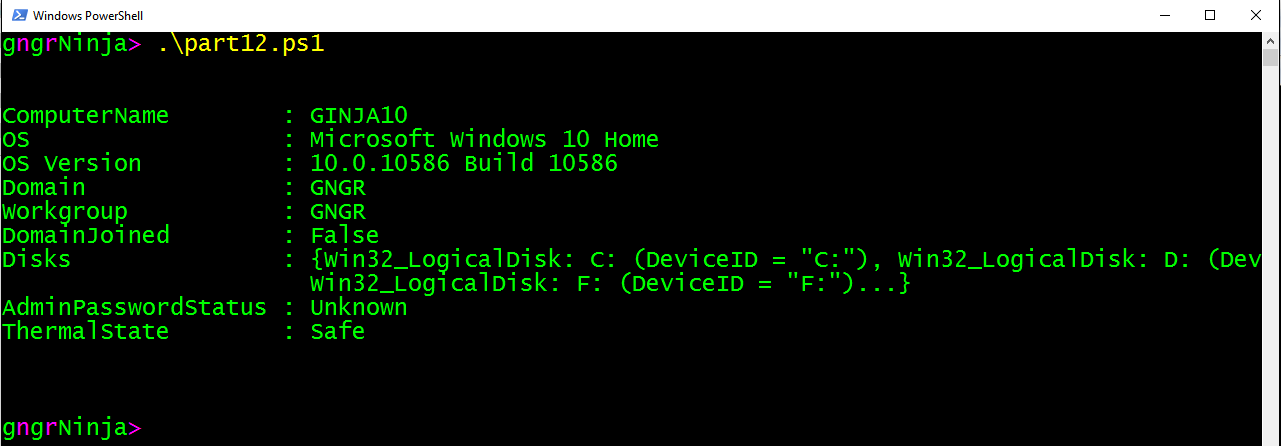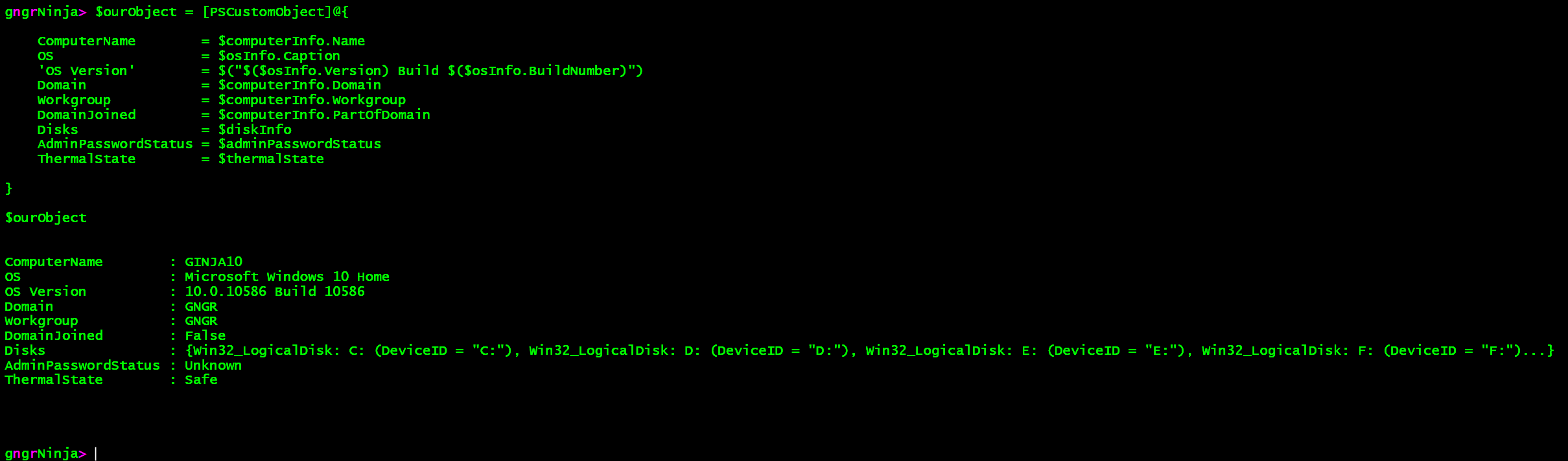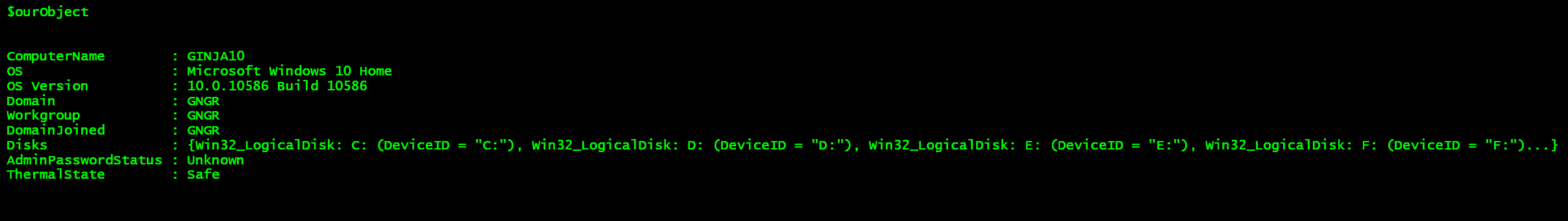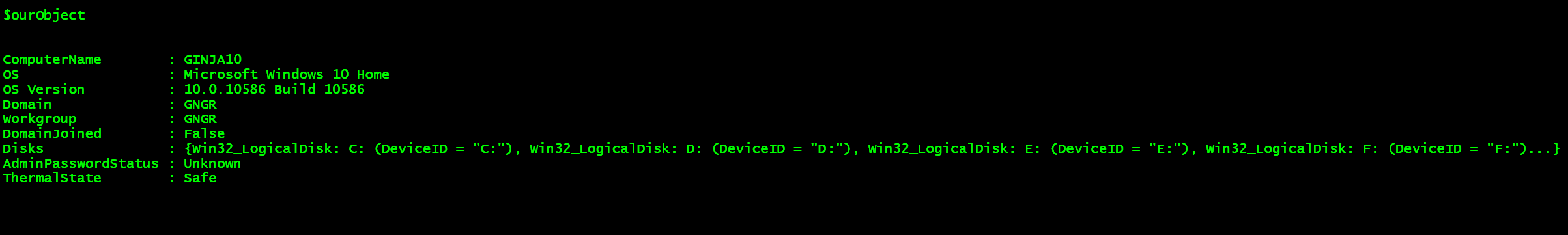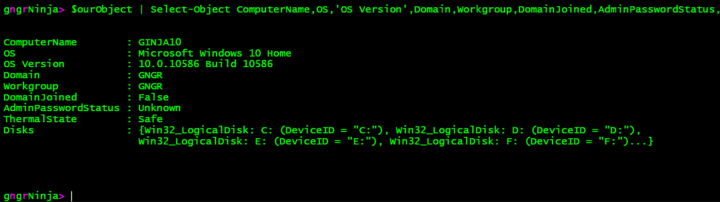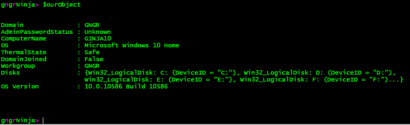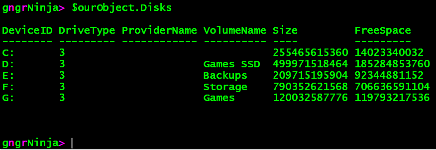 That worked! We created an object, which contains information from all three sources. We can type $ourObject.Disks to see what is contained there.
