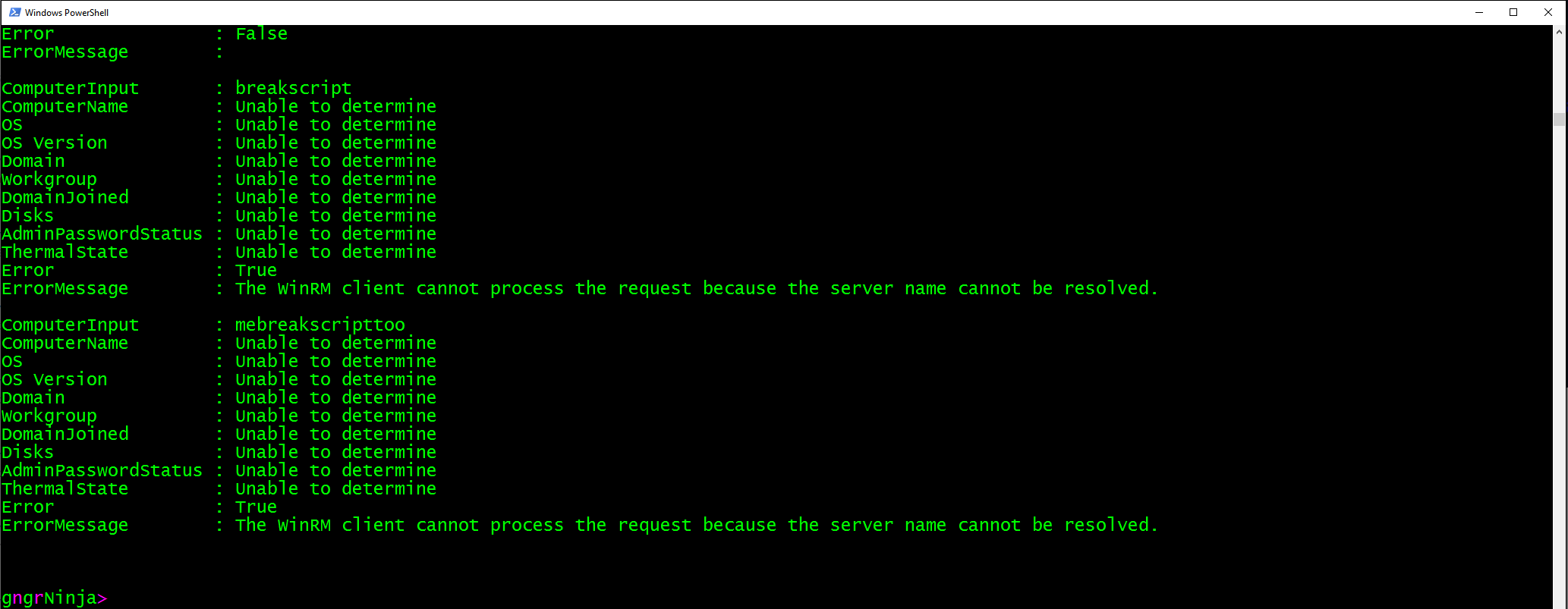 You have a list of computers that you need to get information from. You want to capture any error messages that may come up. You also would like to capture what the computer name in the file was (which we will as ComputerInput), as well as the computer name returned when querying for information. We'll also want to gather the operating system and disk information.