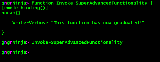 Let's go back to our function Invoke-SuperAdvancedFunctionality from earlier, and call it with the -Verbose flag.