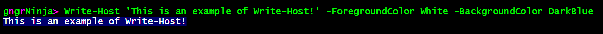 Write-Host 'This is an example of Write-Host!' -ForegroundColor White -BackgroundColor DarkBlue