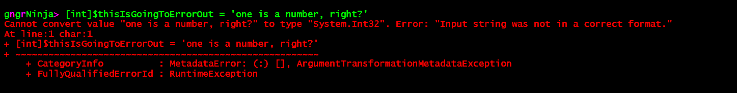 [int]$thisIsGoingToErrorOut = 'one is a number, right?'