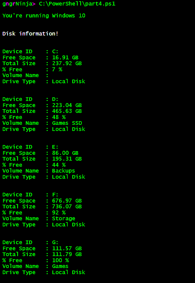 Write-Host ("% Free : {0:P0} " -f $($disk.FreeSpace / $disk.Size))I hope you've enjoyed the series so far! As always, leave a comment if you have any feedback or questions!