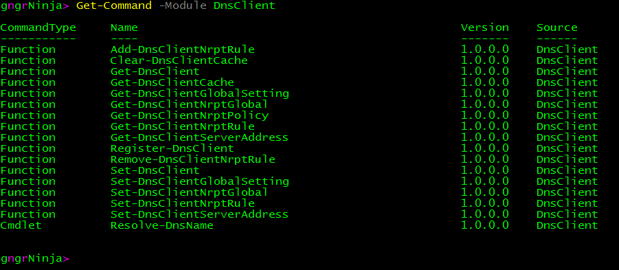 Get-Command -Module DnsClientThe above command will show us the commands available in the DnsClient module.