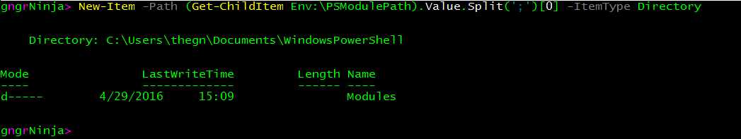 New-Item -Path (Get-ChildItem Env:\PSModulePath).Value.Split(';')[0] -ItemType Directory