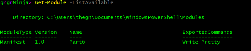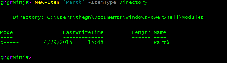 Set-Location (Get-ChildItem Env:\PSModulePath).Value.Split(';')[0]Create a folder for our module named Part6. Note: This is what PowerShell will display the module name as.