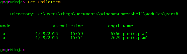 New-ModuleManifest -Path .\part6.psd1 -NestedModules 'part6.psm1'Use Get-ChildItem to list out the files. You should see part6.psm1 and part6.psd1.