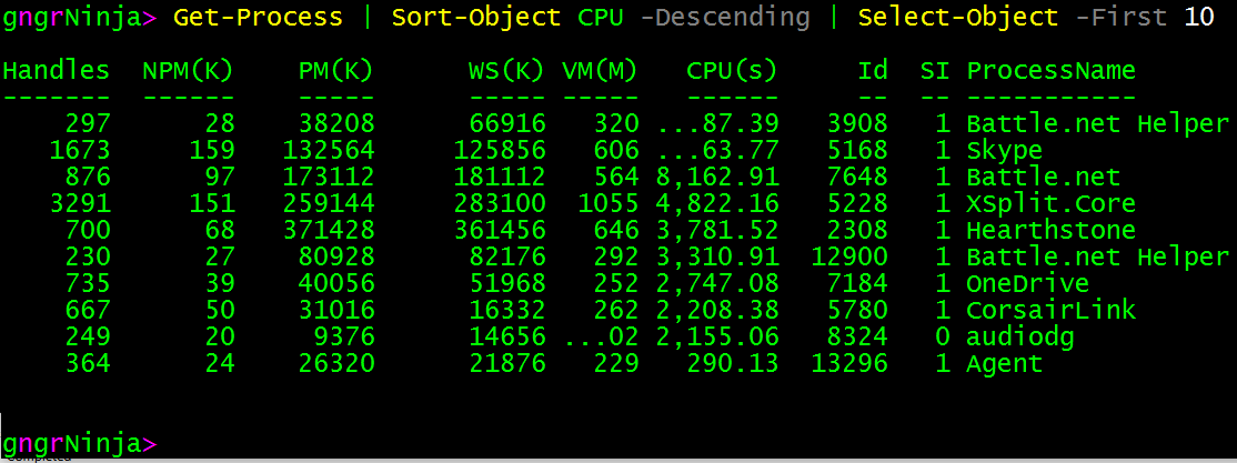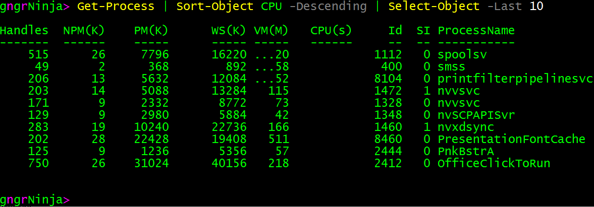The above command takes Get-Process, then pipes it to Sort-Object (which we have sorting by CPU, descending), and then pipes that to Select-Object so we can specify that we want to see the First 10 results only.