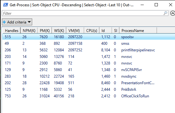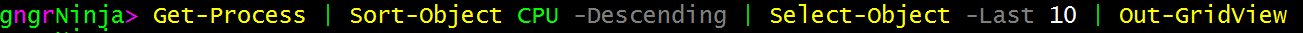 Get-Process | Sort-Object CPU -Descending | Select-Object -Last 10 | Out-GridView