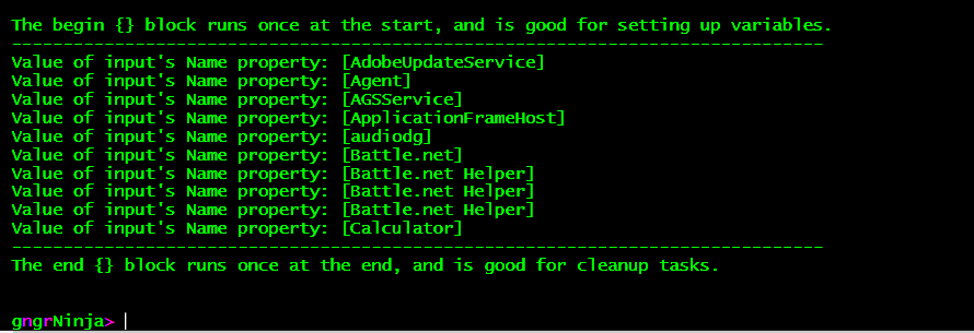 In this example we did not have to expand upon the incoming object's values, as it only gave us the property name values to begin with. That is, we didn't have to use $input.Name, we just had to use $input.