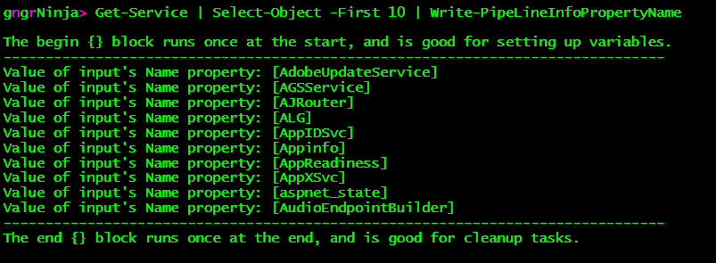 Get-Service | Select-Object -First 10 | Write-PipeLineInfoPropertyName